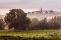 Kerkje van Sippenaeken op een koude herfstdag gedurende zonsopkomst
