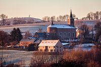 De kerk van Sippenaeken in de opkomende zon, net over de Belgische grens bij Cottessen in Zuid-Limburg
