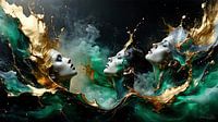 De kleurencompositie - een levendig samenspel van goud, zwart, wit en smaragdgroen - geeft het beeld een bijna alchemistische spanning. Goud symboliseert hier geen bezit, maar transformatie; het diepe groen ademt leven en verandering. Tussen de gezichten stijgt fijne rook op, alsof het werk zelf ademt - een stille hint van het onzichtbare dat in elk zichtbaar moment resoneert.