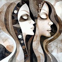 Abstracte figuratieve kunst met vloeiende vormen op een grove textuur in aardetinten met taupe en beige.