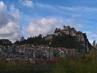 Gezicht op de middeleeuwse citadel op een rots boven het stadje Sisteron, de toegangspoort tot de Provence, in het zuiden van Frankrijk op een bewolkte dag in de herfst met historische gebouwen.