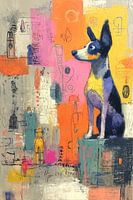 Een hond zit keurig te midden van een chaotisch, kleurrijk decor. Zijn rust vormt een grappig contrast met de wilde wereld achter hem.