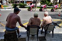 Six pink men: Team time trial in Salou, Volta a Catalunya (Tour of Catalonia pro cycling). Team Kaiku and 3 British tourists.