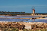 Salzgarten mit Verdunstungsbecken und Windmühle. Die Salina Infersa befindet sich in Murana in der Nähe von Marsala. Von Marsala nach Trapani führt die Via del Sale, die Salzstraße. Die Windmühlen dienen als Pumpen für die Salzsole. Die Mühlsteine in der Mühle zerkleinern der Salzbrocken, Murana, Trapani, Sizilien, Italien, Europa
