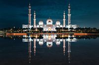 Sjeik Zayed Moskee in Abu Dhabi. Gebedshuis met minaretten voor moslims, islam. Verlicht met lampen in het donker. Wit marmer gebouw, symmetrie reflectie in water