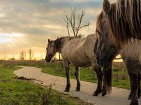 Twee konikspaarden, aan de kop van een kudde, sjokken een pad af in de Oostvaardersplassen. Dode bomen steken hun kruinen naar de hemel uit. De zon gaat gelig onder.
