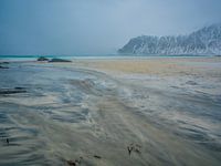 Water stroom naar de oceaan op het strand van Skagsanden, Lofoten, Noorwegen