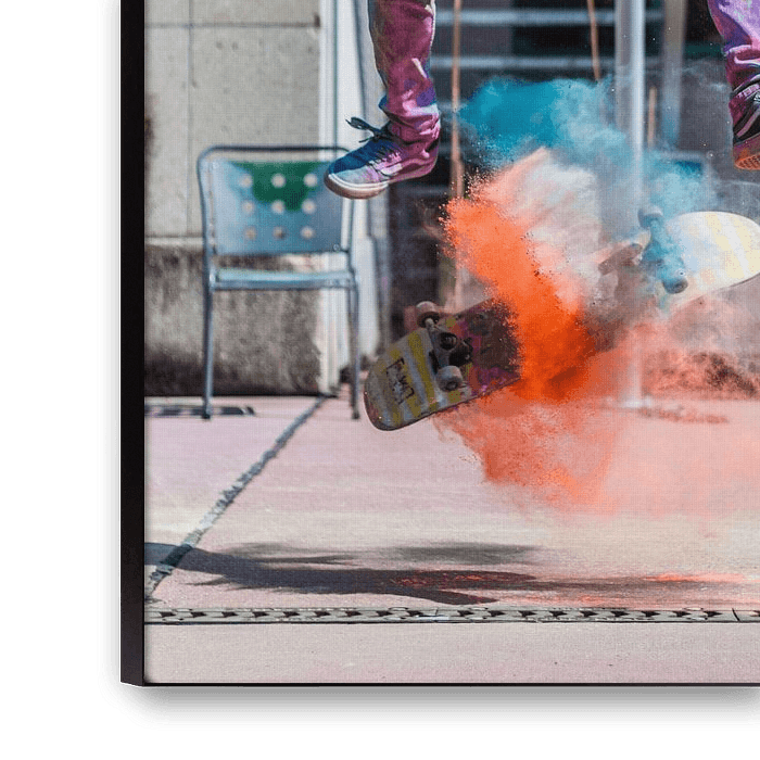 Skater macht einen Kickflip mit Holi Pulver auf dem Brett