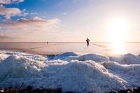 Winter in the Netherlands means skating on the ice in this picture a big lake froze over and people are skating on it.