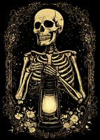 Een fijn getekend skelet houdt een gloeiende lantaarn in zijn handen, omlijst door florale ornamenten. De geel-gouden kleur geeft het sombere tafereel een warme tint. Het motief speelt met thema's als vergankelijkheid, herinnering en licht in het donker.