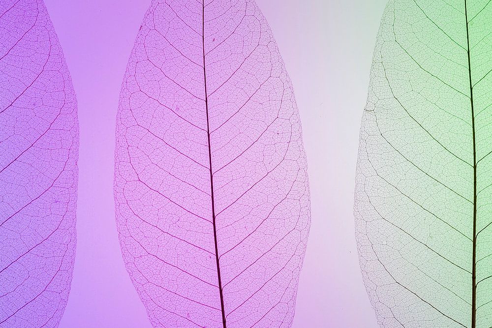 Foto van skeletbladeren met verschillende kleuren verlichting.