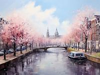 Dit schetsmatige schilderij van het Amsterdamse landschap omhult de kijker met een zachtheid die kenmerkend is voor de stad. De contouren van de grachtenpanden en bruggen verschijnen in subtiele lijnen tegen een achtergrond van zachte pasteltinten. De reflectie van de gebouwen in het water geeft een kalme en harmonieuze uitstraling. De…