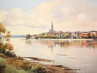Dit schetsmatige schilderij van het Nijmeegse landschap betovert met zijn zachte kleuren en subtiele charme. De contouren van historische gebouwen en bruggen verschijnen als lichte penseelstreken tegen een achtergrond van warme pasteltinten. De Waal, stromend door het tafereel, wordt weergegeven met kalme lijnen. De sfeer ademt een…