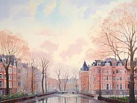 Dit schetsmatige schilderij van het Den Haagse landschap verwelkomt de kijker met een delicaat palet van zachte kleuren. De contouren van statige gebouwen en bomen worden op een subtiele manier weergegeven, gehuld in een serene waas van pasteltinten. De lucht straalt rust uit, met lichte penseelstreken die de stad in een kalme gloed hullen. De algemene sfeer ademt een tijdloze elegantie uit, waardoor het schilderij een serene en verfijnde weergave is van Den Haag.