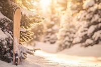 Gehuld in zacht, gouden licht staat een eenzaam snowboard in de ongerepte witte pracht van de sneeuw. Omringd door majestueuze dennenbomen nodigt het winterse landschap uit tot avonturen en spannende afdalingen. De glinsterende sneeuw glinstert mysterieus, terwijl de sfeer perfect is voor onvergetelijke ervaringen in het winterlandschap.