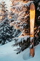 Een eenzaam snowboard troont midden in een winters sprookjeslandschap, omringd door besneeuwde dennenbomen. De warme gouden zonnestralen kussen het hout, terwijl de glinsterende sneeuw schittert in het licht. Deze scène vertelt over poederafdalingen en onvergetelijke momenten in de ongerepte natuur, waar avontuur en rust harmonieus samengaan.