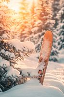 In het rustige winterlandschap schijnt het zachte licht van de avondzon door de besneeuwde dennenbomen. Een eenzaam snowboard, zachtjes ingebed in het witte pluis, wacht om de besneeuwde hellingen af te suizen. Dit tafereel ademt avontuur en vrijheid, terwijl de koele lucht de verwachting inhoudt van de afdalingen die komen gaan.