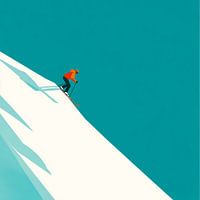 Een dappere skiër glijdt over de besneeuwde piste, vakkundig gekleed in een levendig oranjerood. Door de minimalistische compositie met zachte, turquoise achtergronden lijken de scherpe schaduwen van de besneeuwde vormen bijna kunstwerken. Het vleugje avontuur en de rustige uitgestrektheid van het landschap creëren een aura van vrij…