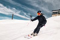 Skien op de Hintertux Gletsjer in Oostenrijk. Deze foto heb ik gemaakt met een relatief lange sluitertijd terwijl ik achter deze skiester aan snowboarde. Dit geeft een gevoel van snelheid en is de reden waarom de sneeuw lijkt te bewegen.