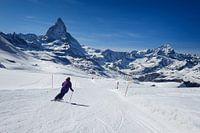 Een vrouwelijke skiër, zonder helm, aan het skiën door de verse sneeuw op de lege piste naar de Matterhorn berg in de Zwitserse Alpen tijdens wintersport in Zermatt, Wallis, Zwitserland.