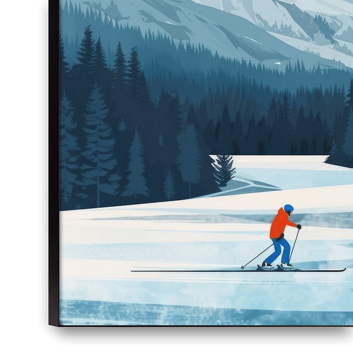 Deze minimalistische afbeelding van een skiër in een besneeuwd berglandschap legt de serene en majestueuze schoonheid van de bergen vast. De strakke lijnen en koele kleurtinten creëren een rustgevende en indrukwekkende sfeer. Perfect voor winterliefhebbers die op zoek zijn naar een elegante en stijlvolle decoratie.