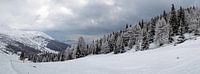 Panorama van besneeuwde bergen aan de rand van de skipiste in het Serfaus-skigebied in Tirol, Oostenrijk.