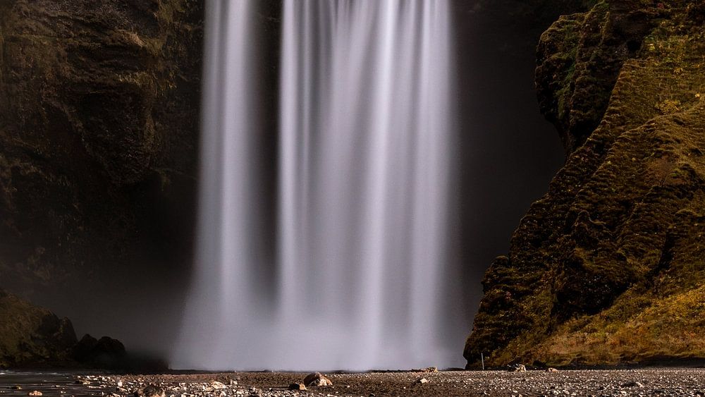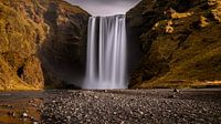 Deze foto is gemaakt op een regenachtige ochtend, waar de zon zich schaars liet zien, maar met wat geduld kwam deze toch even door de wolken. Het resultaat mooi goud licht over de bergwanden van Skógafoss.