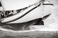 Moment uit een zeilwedstrijd op het IJsselmeer bij Stavoren om het SKS Skûtsjesilen Kampioenschap 2017 . De boeg van het skûtsje van Akkrum komt helemaal uit het water door de hoge golven