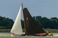 Skûtsje klassieke Friese tjalk zeilboot op het IJsselmeer bij Lemmer tijdens de jaarlijkse skûtsjesilen wedstrijd in Friesland.