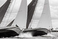 Twee skûtsjes in een stijvol duel tijdens een race om het kampioenschap Skutsjesilen in Friesland