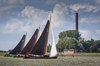 De skûtsjes van Sneek, Earnewald en Drachten op weg naar een boei met op de achtergrond het grootste stoomgemaal van de wereld; het Ir. Woudagemaal in Lemmer