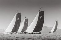 Donkere regenlucht boven het Sneekermeer tijdens de Waterpoortrace 2019 voor skûtsjes. In beeld zijn v.l.n.r. Huzum, Halve Maen, Earnewâld en Joure