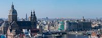 De skyline van Amsterdam gezien vanaf de sky lounge van het Hilton hotel dat naast het Centraal station is gelegen. Op de voorgrond is de Sint Nicolaas basiliek goed te zien.