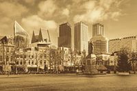 De Haagse skyline gezien vanaf Plein in Den Haag tijdens de kersttijd. (Sepia versie)