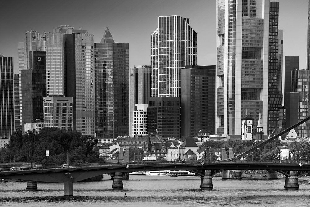 Zwart-Wit opname over het water van het moderne zakencentrum van Frankfurt am Main.