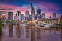 Skyline Frankfurt met dramatische zonsondergang met reflectie in de main