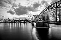 Zwart-witte fotoskyline Keulen met Groß St. Martin, Dom van Keulen en Hohenzollern-brug bij nacht, Rijn, Noordrijn-Westfalen, Duitsland