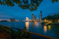 Vanuit het Buizenpark op Katendrecht heb je een prachtig uitzicht op de skyline van de Kop van Zuid. Nog mooier is het als er twee grote schepen langs de kade liggen en opgaan in die skyline.