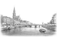 Dit kunstwerk toont een gedetailleerde zwart wit potloodtekening van een sfeervol Europees stadsgezicht langs een brede rivier. In het midden van de compositie staat een imposante kerk met een hoge torenspits, omringd door rijen traditionele gebouwen die de historische charme van de stad benadrukken. Links overspant een stenen boogbrug…