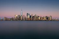 Skyline New York, Manhattan. Een imposant stadsgezicht van de wolkenkrabbers van Manhattan met onder meer het One World Trade Center WTC, Empire State Building en het gebouw van de Verenigde Naties. De foto is gemaakt met een lange sluitertijd tijdens de schemering waarin het licht van de afterglow na zonsondergang nog is te zien.