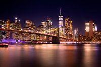 Skyline New York met het mooie Manhattan en Brooklyn Bridge. Een prachtig stadsgezicht van één van de meest indrukwekkende skylines ter wereld. Het hoogste gebouw op de foto is het WTC One World Trade Center. De foto is gemaakt in de avond tijdens de schemering van het blauwe uur met een lange sluitertijd net voordat het nacht wordt.