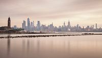 Skyline New York, Manhattan, Verenigde Staten. Prachtig stadsgezicht in panorama over de Hudson rivier op de wolkenkrabbers met onder meer het Empire State Building. De foto is gemaakt met een lange sluitertijd in de ochtend.