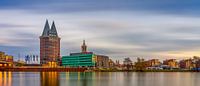 Skyline Roermond, lange belichting bij zonsondergang. Goed zichtbaar de Natalinitoren, het Aureool, de Maasbrug etc.