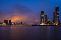 De skyline van Rotterdam met de Erasmusbrug die oranje kleurt vanwege de Internationale dag tegen geweld tegen vrouwen.