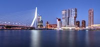 Zicht op de Erasmusbrug en skyline van Rotterdam in Nederland op het blauwe uur na zonsondergang