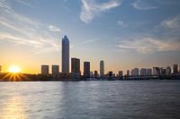 Ondergaande zon met zicht op Rotterdam centrum. Vanaf de Kop van Zuid, welke vaak op de foto wordt gezet, heb je een mooi zicht op de skyline van het centrum van Rotterdam. Dit wordt extra kleur gegeven door de ondergaande zon.