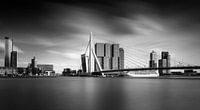 De skyline van Rotterdam in een zwart/wit bewerking. Door de lange sluitertijd is het water glad en komt er beweging in de lucht.