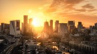 Uitzicht op de Rotterdamse skyline tijdens zonsondergang, met zicht op onder andere op de Willemswerf, Red Apple, het Witte Huis en de Markthal.