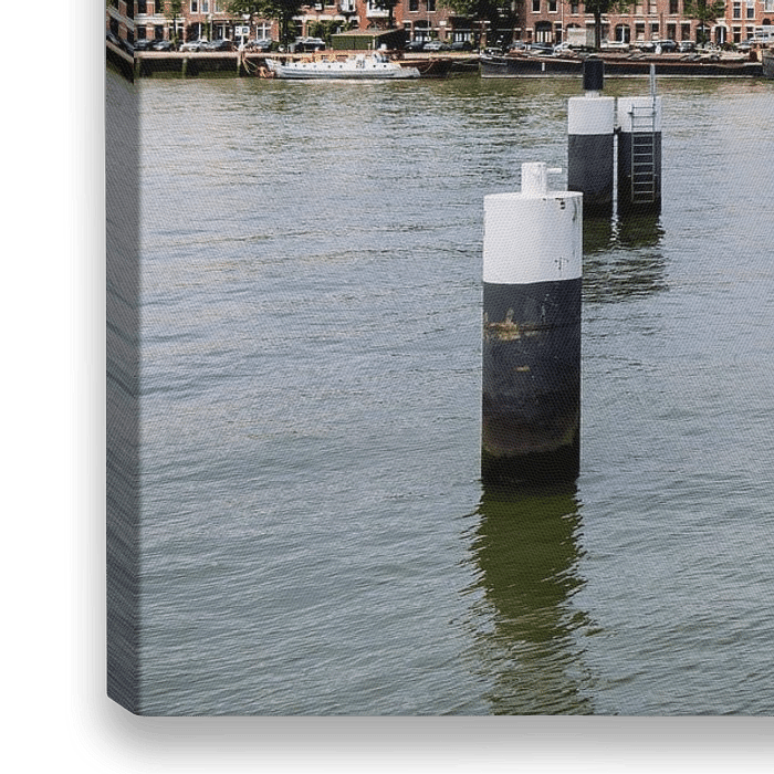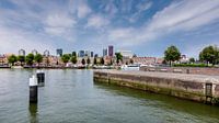 Skyline Rotterdam vanaf de Zuidoever. Aan de kade langs de meerpalen doemen de hoge gebouwen op van de stad Rotterdam. Mooie Hollandse luchten lichten de stad verder op. Met in de verte de Willemsbrug.