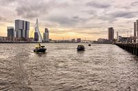 Uitzicht over de skyline van Rotterdam met op de voorgrond de watertaxi's.